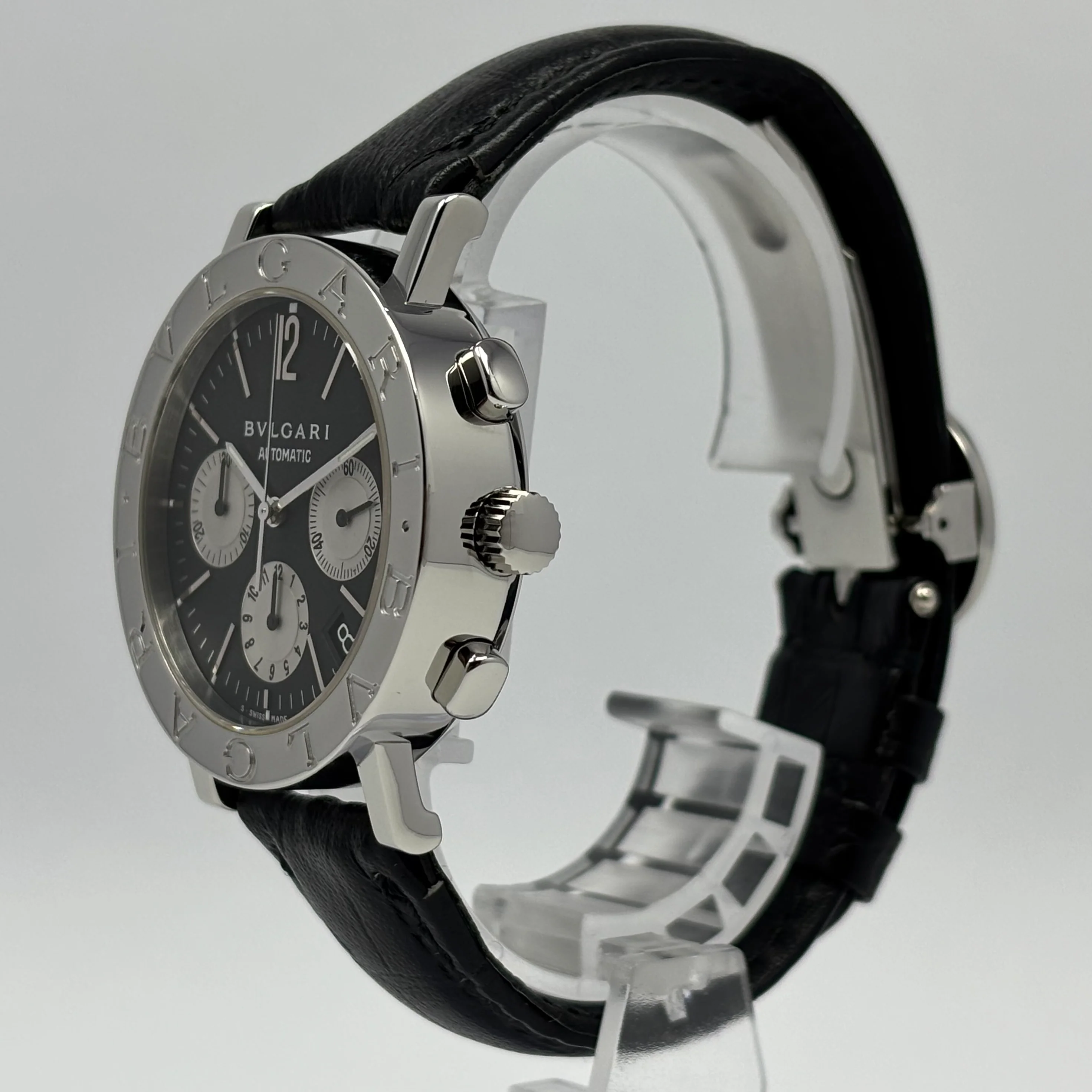 El Bvlgari BB38SLCH es un reloj cronógrafo automático que combina la artesanía suiza con la elegancia italiana. Este modelo presenta una caja de acero inoxidable de 38 mm de diámetro, alberga una esfera negra con índices en bastón y el número arábigo 12 aplicado. La esfera incorpora tres subesferas plateadas para el segundero continuo, el contador de 30 minutos y el de 12 horas, además de una ventana de fecha ubicada entre las posiciones de las 4 y las 5 en punto.