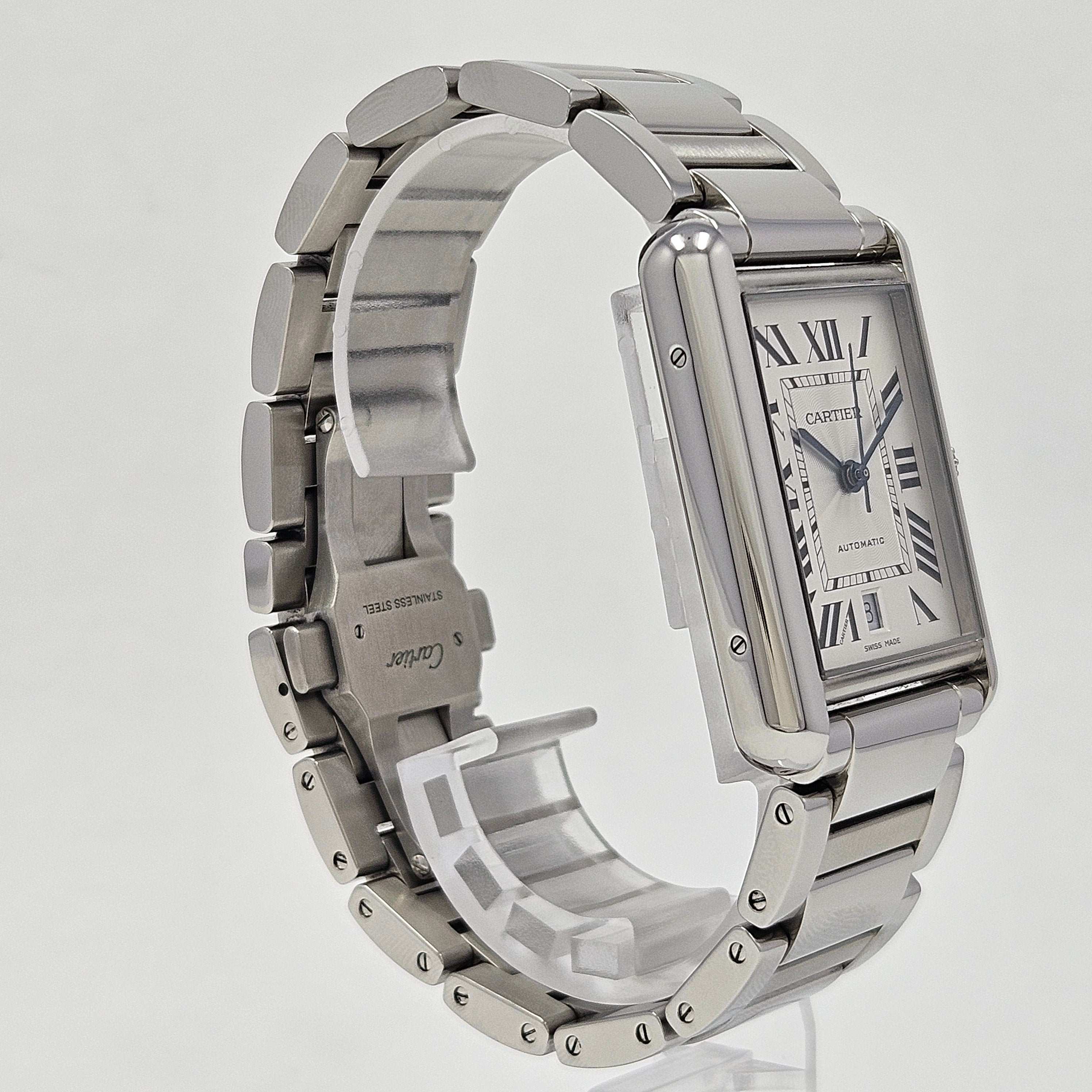 El Cartier Tank Solo XL, referencia 4324, es un reloj que encarna la elegancia clásica y el diseño atemporal característicos de la marca Cartier. Este modelo presenta una caja rectangular de acero inoxidable de 31 x 41 mm, complementada con una esfera plateada adornada con números romanos y agujas en forma de espada de acero azulado. Equipado con un movimiento automático calibre 1847 MC, ofrece funciones de horas, minutos, segundos y fecha, esta última ubicada a las 6 en punto. El cristal de zafiro protege la esfera, mientras que el brazalete de acero inoxidable aseguran una sujeción cómoda y segura. Con una resistencia al agua de hasta 30 metros, el Cartier Tank Solo XL 4324 combina sofisticación y funcionalidad, siendo una elección ideal para quienes buscan un reloj de lujo con un diseño icónico.