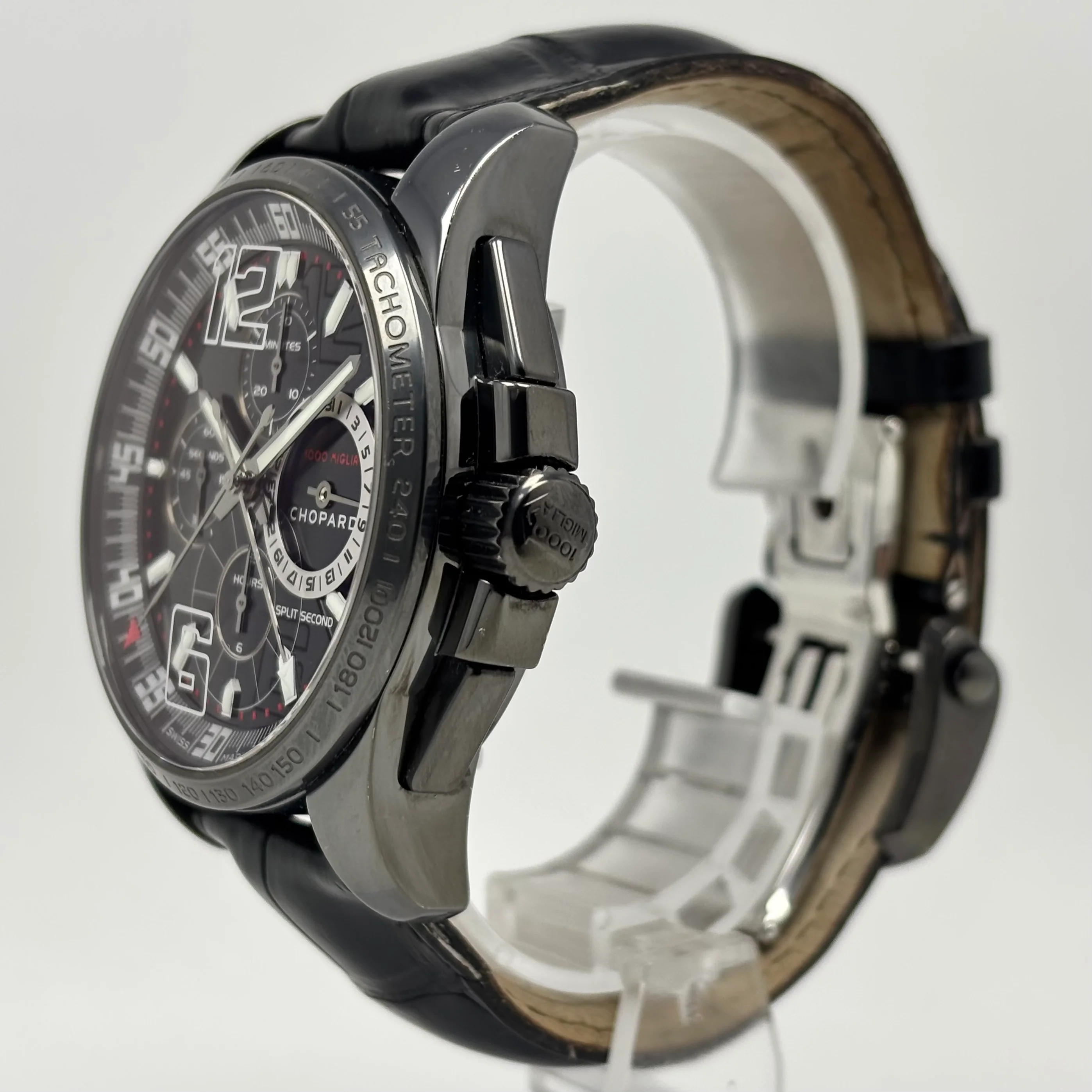 El Chopard Mille Miglia 168513-3002 es un cronógrafo suizo automático con caja de acero PVD negro de 44 mm, movimiento Joux-Perret 8721 (con función split-seconds y ~46 h de reserva), esfera negra con múltiples subesferas, correa de Piel y resistencia al agua de 50 m. Parte de la línea Mille Miglia, homenaje a la legendaria carrera automovilística, este modelo fusiona técnica avanzada, espíritu deportivo y exclusividad gracias a su producción limitada.