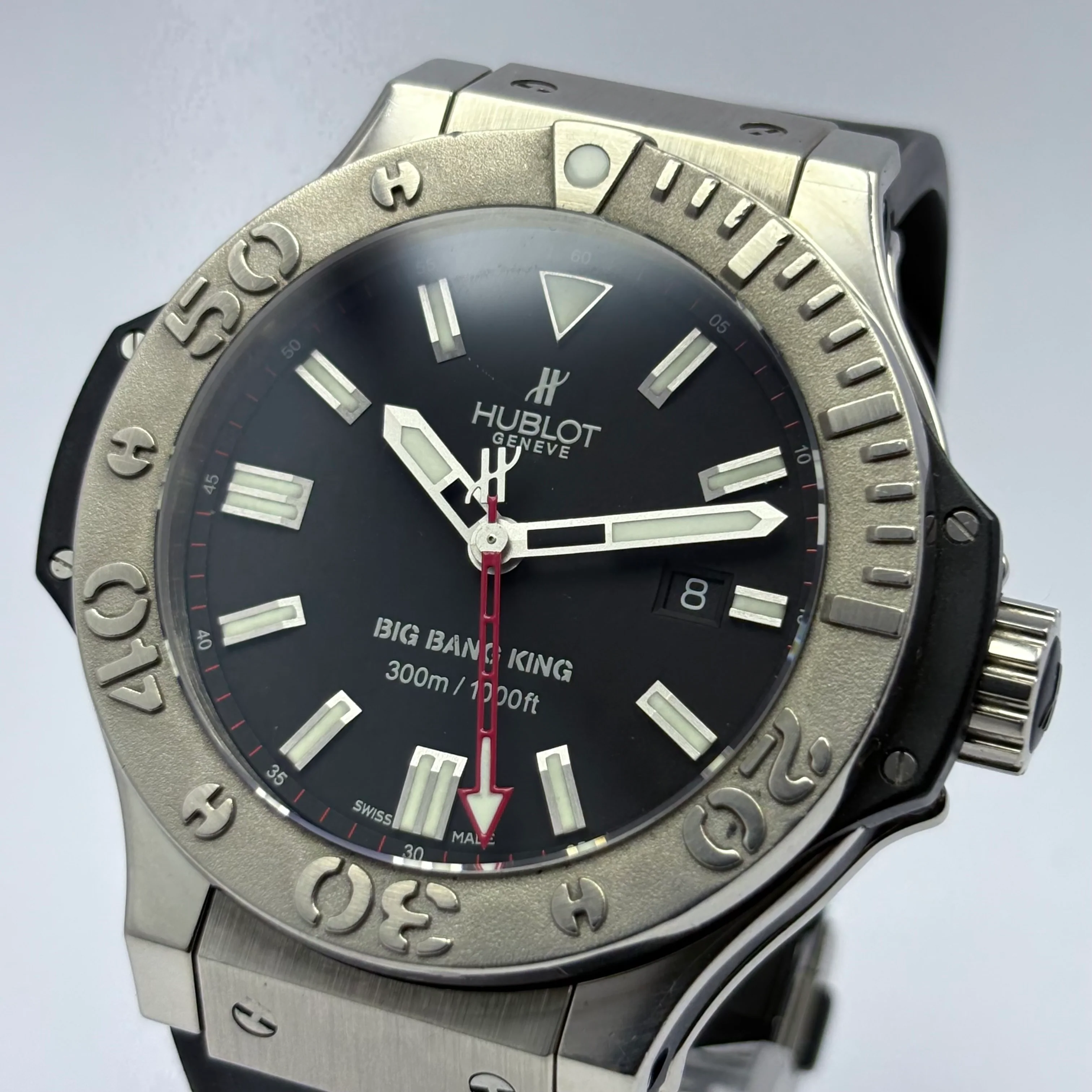 El Hublot Big Bang King 322.LX.100.RX destaca no solo por su diseño imponente de 48 mm, sino por estar confeccionado en paladio, un material precioso muy poco común en la relojería de lujo. La caja, el bisel giratorio unidireccional y la corona están fabricados en paladio, aportando una tonalidad platino-clara singular, junto con una presencia robusta de buceo (resistencia hasta 300 m).