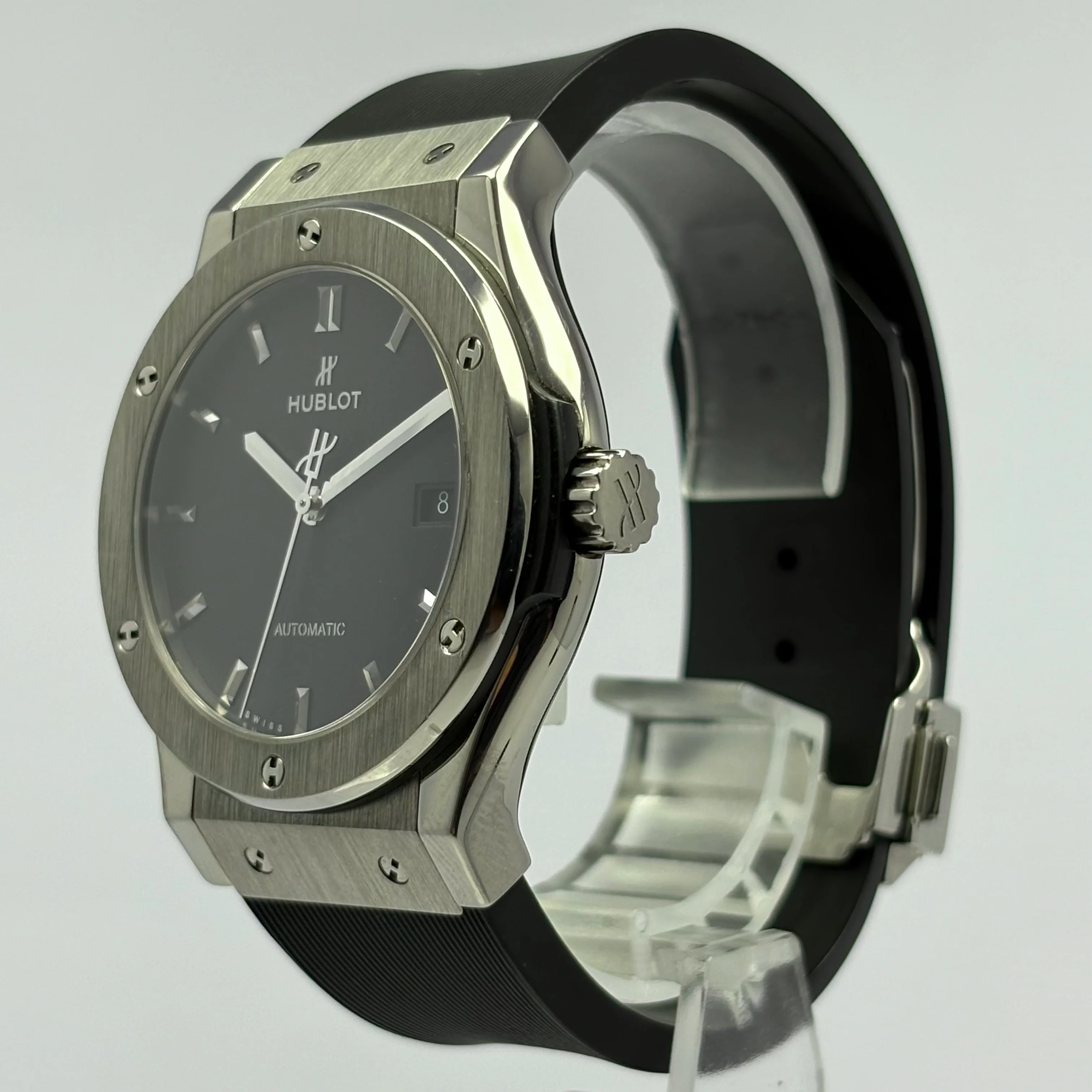 El Hublot Classic Fusion 42mm en titanio es la perfecta fusión entre innovación y diseño contemporáneo. Su caja de 42 mm, en titanio pulido y satinado, se complementa con un bisel vertical de titanio con 6 tornillos en forma de “H”, que realza su carácter moderno. La esfera negra, sobria y elegante, presenta detalles precisos en manos y marcadores, junto con una función de fecha en posición sutil. Impulsado por el movimiento automático HUB1110, ofrece una reserva de marcha de 42 horas y está protegido por un cristal de zafiro resistente a arañazos. Además, su correa de caucho negro y su fondo de caja transparente, ideal para el hombre que busca estilo y precisión en cada detalle.