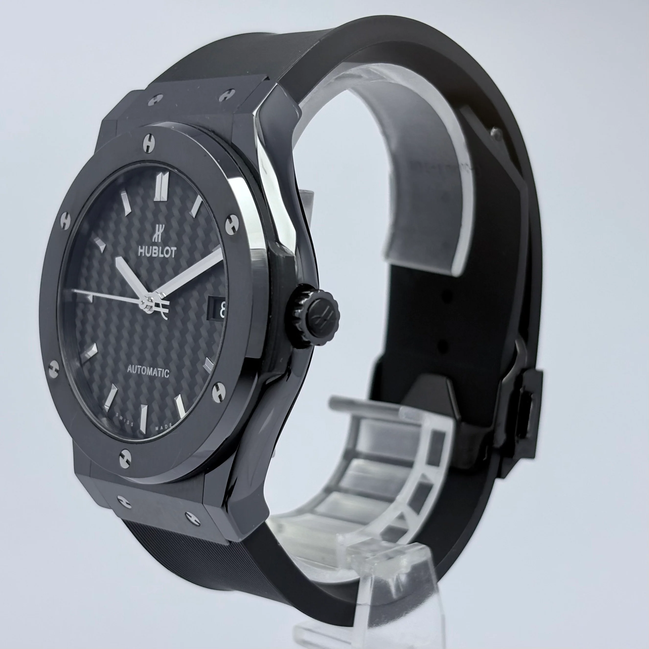 Este modelo destaca por su carátula de fibra de carbono, un material ligero y extremadamente resistente que aporta profundidad visual y un carácter moderno, manteniendo una excelente legibilidad. Su caja de cerámica negra ofrece gran durabilidad y resistencia a rayaduras, mientras que el bisel con los característicos tornillos en forma de “H” reafirma el ADN inconfundible de Hublot.