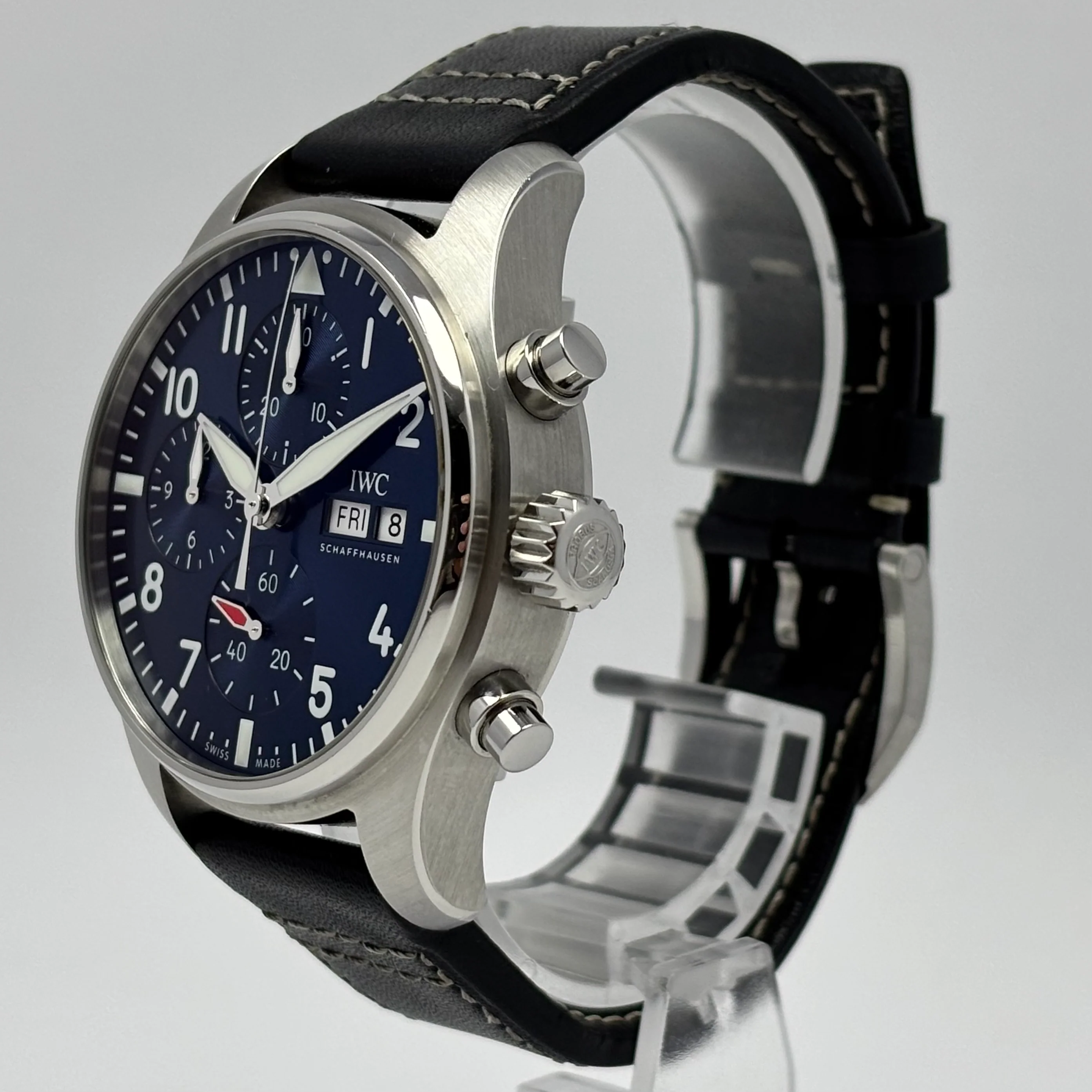 (referencia IW388101) combina funcionalidad y elegancia en un diseño de 41 mm de diámetro. Equipado con el calibre 69385, un movimiento cronógrafo automático de manufactura propia, ofrece una reserva de marcha de 46 horas. Su esfera azul presenta contadores de cronógrafo, indicación de fecha y día, y pequeño segundero situado a las 6. La caja de acero inoxidable es hermética hasta 10 bar y está acompañada por una correa de piel de becerro azul con el sistema EasX-CHANGE para un cambio rápido.