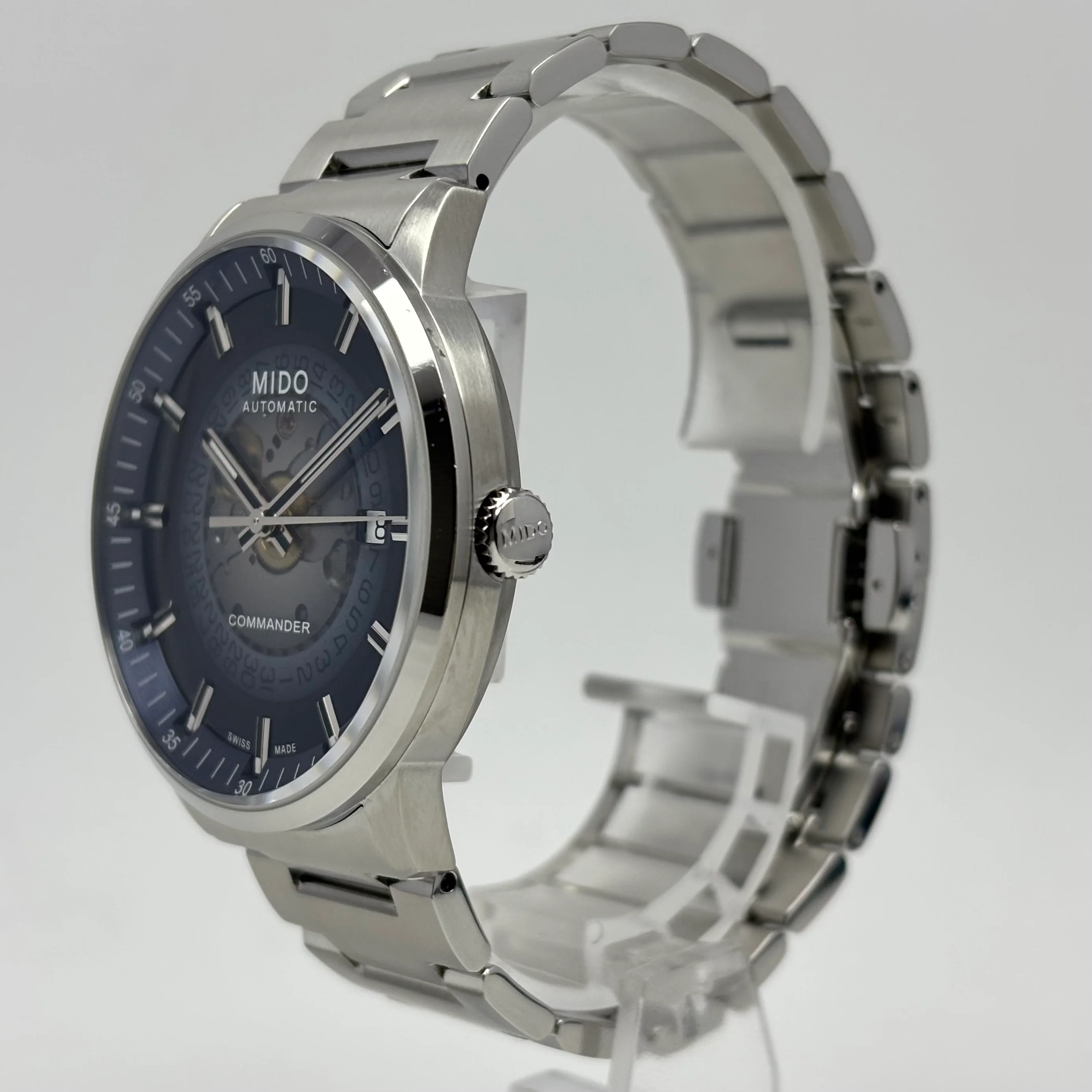 El Mido Commander Gradient (Ref. M021.407.A) se distingue por su esfera acrílica transparente con un elegante efecto ahumado degradado, un detalle inédito en la línea Commander. Esta innovación permite observar el Calibre 80 desde el frente y también desde el fondo transparente de la caja, ofreciendo una experiencia visual muy técnica y atractiva.