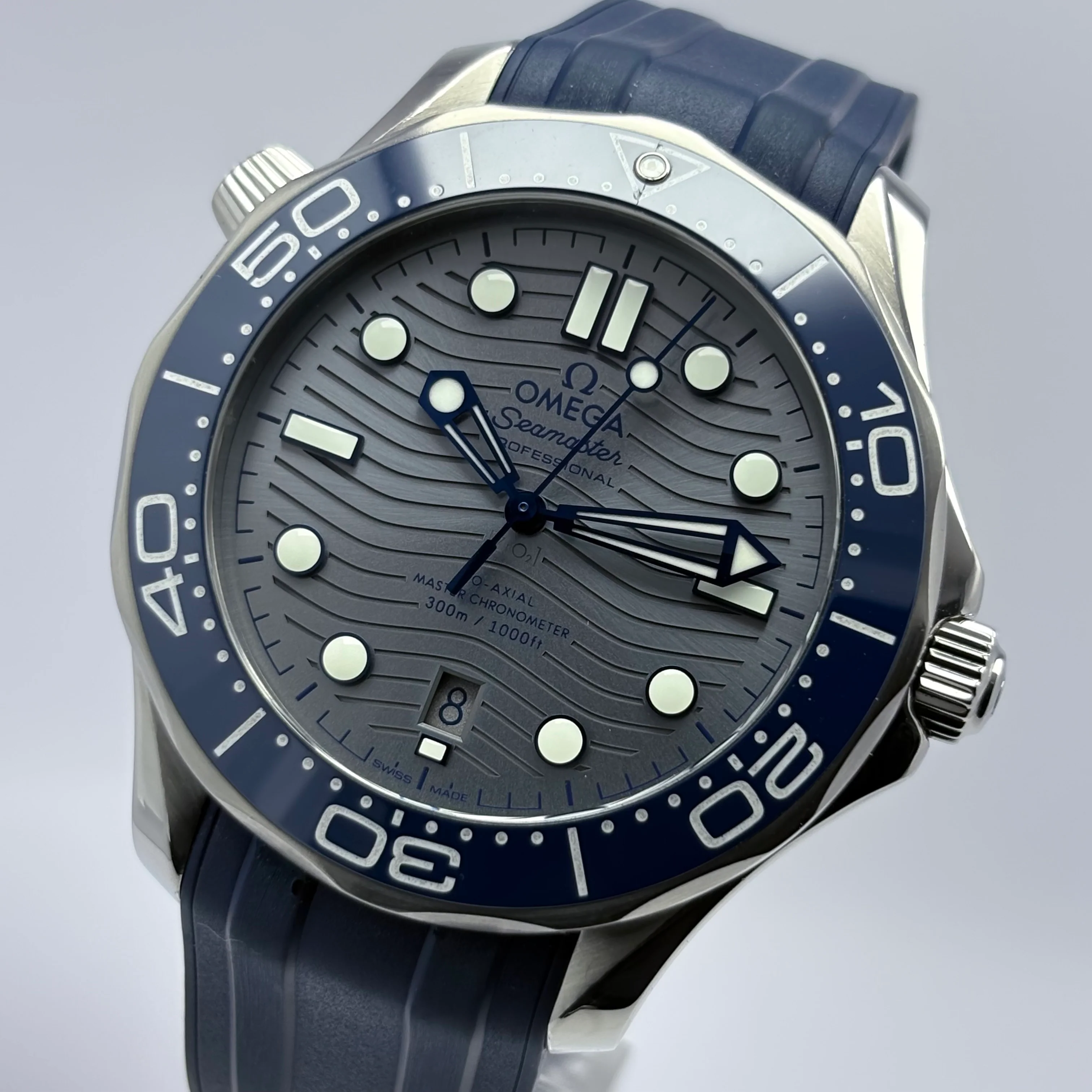 La referencia 210.32.42.20.06.001 destaca por su esfera gris con patrón de olas láser grabadas, bisel cerámico azul y correa de caucho que evocan el espíritu marino de la colección Seamaster. Está impulsado por el calibre automático 8800 Master Chronometer, desarrollado por Omega para ofrecer gran precisión, resistencia magnética y una reserva de marcha de aproximadamente 55 horas, lo que lo convierte en un reloj confiable tanto dentro como fuera del agua.