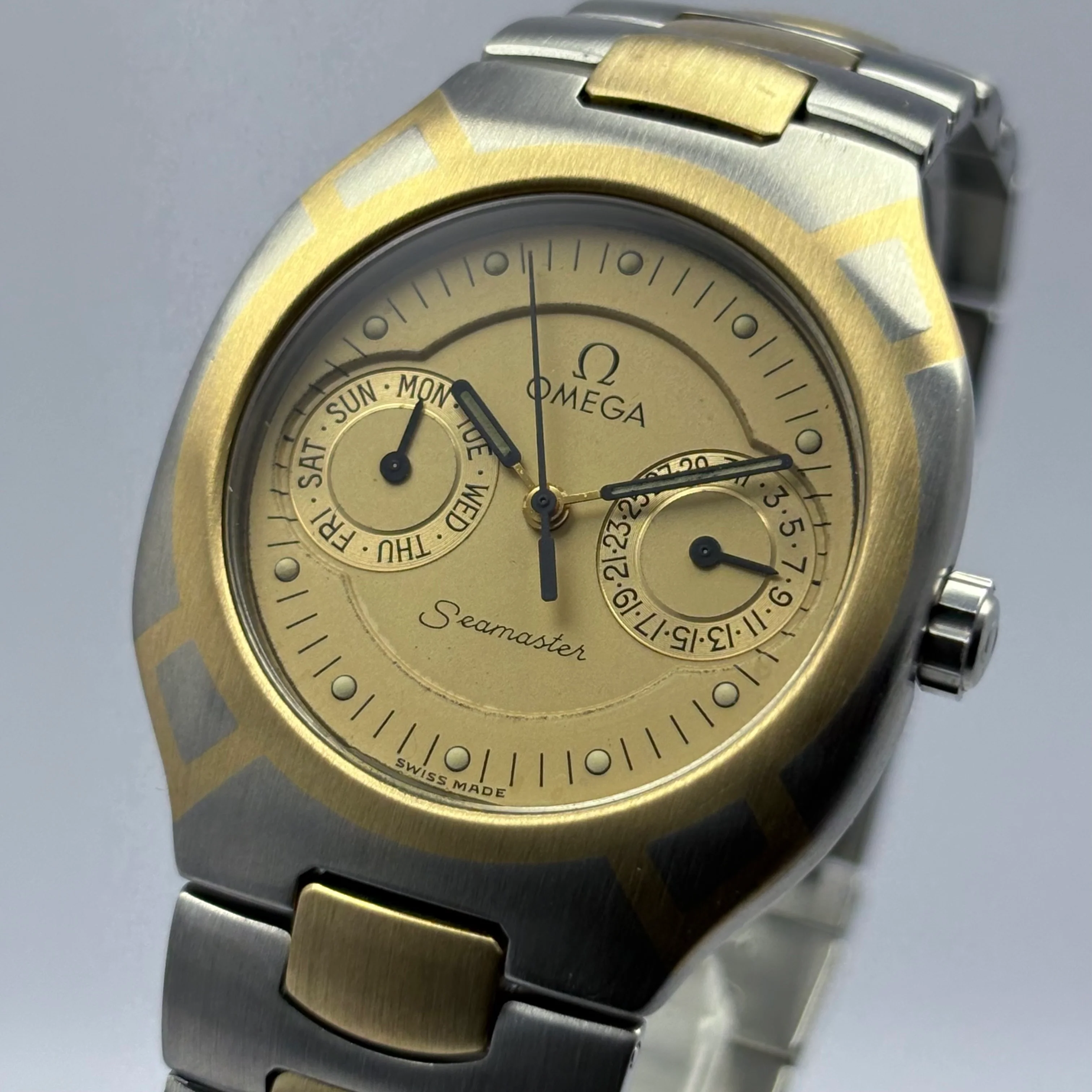 Este modelo destaca por su estética distintiva de dos tonos y una construcción elegante donde el acero inoxidable se combina con inserciones de oro amarillo de 18 k integradas sin juntas visibles en el bisel y el brazalete, un detalle que refleja la técnica avanzada de Omega en ingeniería de materiales de esa década.