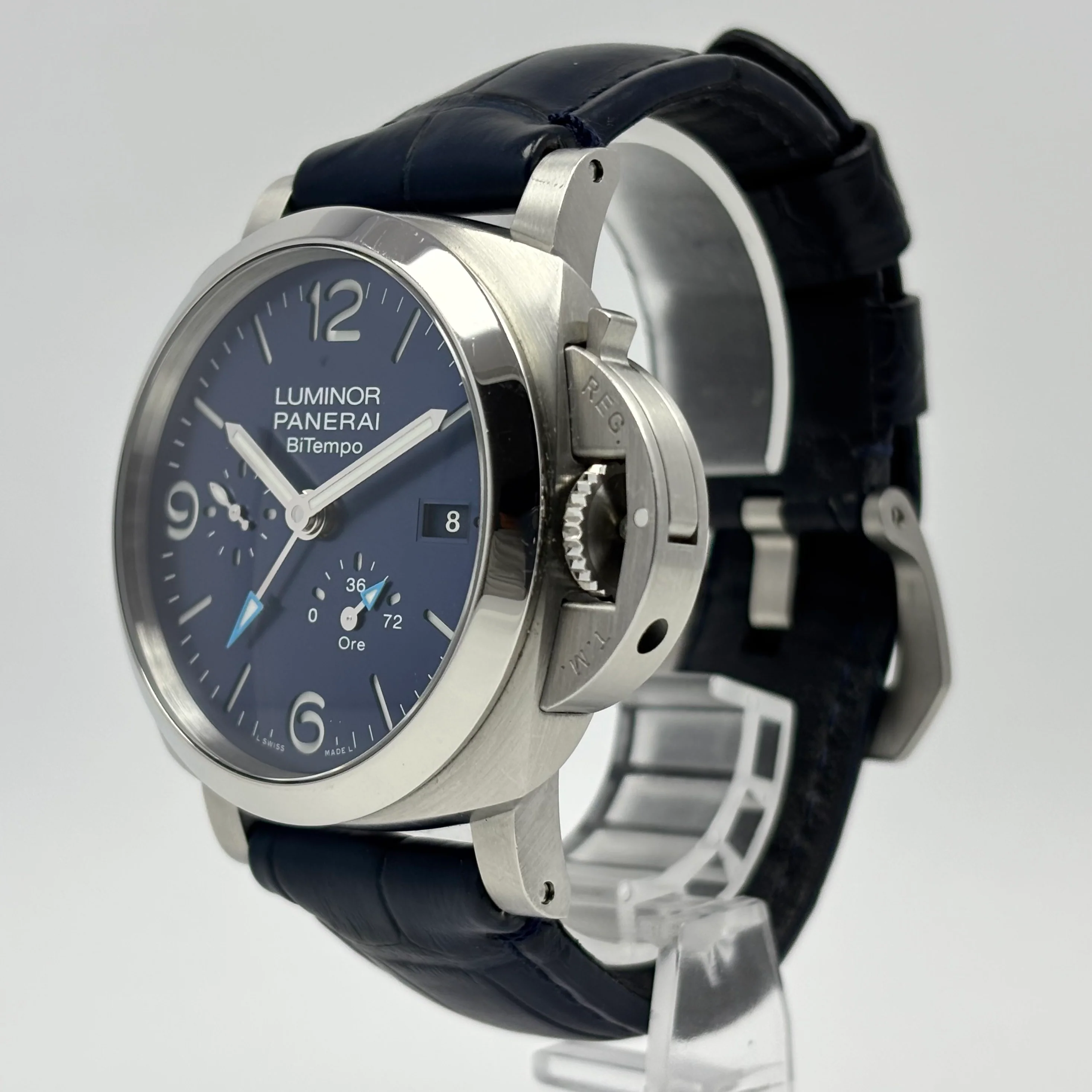 El Panerai Luminor BiTempo PAM01361 es un cronógrafo GMT automático que refleja la moderna evolución de la icónica línea Luminor. Presentado en 2022, cuenta con una caja de acero de 44 mm con casco distintivo y protector de corona Luminor, inspirado en la herencia militar italiana de Panera y fabricado en Florencia desde 1860 .
