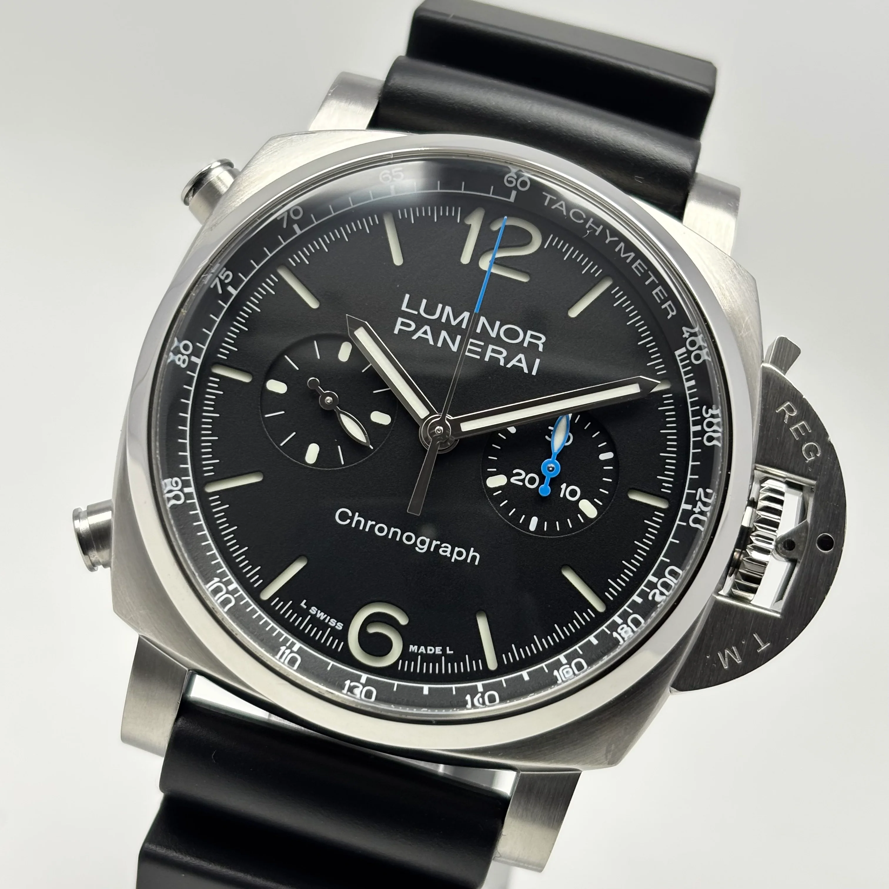 El Panerai Luminor Chrono Ref. PAM01109 es un cronógrafo de carácter robusto y estilo inconfundible que combina la historia militar de Officine Panerai con mecánica suiza moderna. Este modelo, lanzado alrededor de 2021, forma parte de la colección Luminor 1950 Chrono y se presenta en una caja de acero inoxidable de 44 mm de diámetro, esfera negra con numerales árabes luminosos e índices, cristal de zafiro antirreflejo, y resistencia al agua de 100 metros.