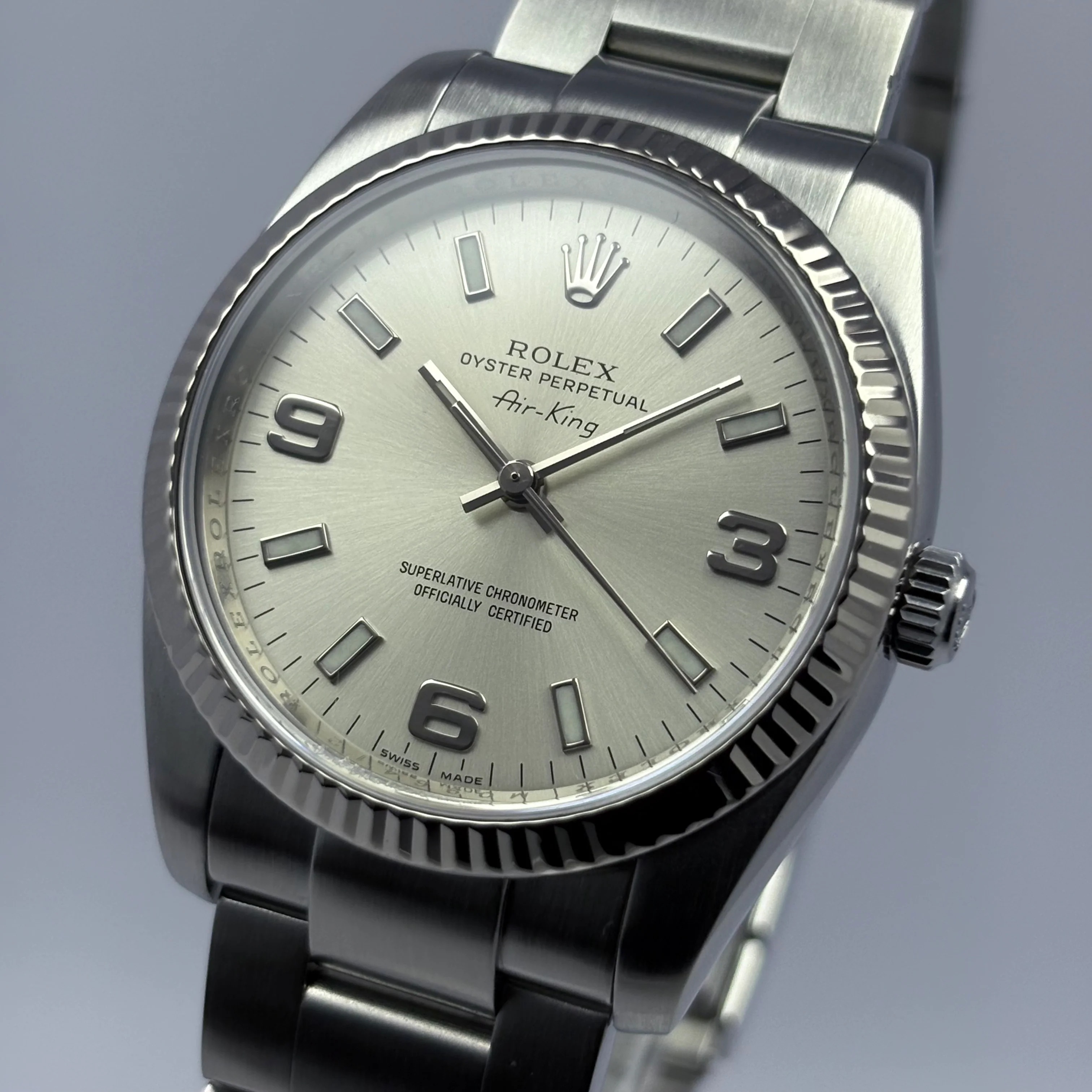 El Rolex Air-King ref. 114234 es un modelo clásico dentro de la colección Oyster Perpetual Air-King, un reloj que Rolex desarrolló como homenaje a la aviación y a la historia de los primeros pilotos, donde primaba la legibilidad, la robustez y la precisión mecánica desde mediados del siglo XX. Esta referencia presenta una caja de 34 mm en acero inoxidable, combinada en muchas versiones con un bisel estriado en oro blanco de 18 k.