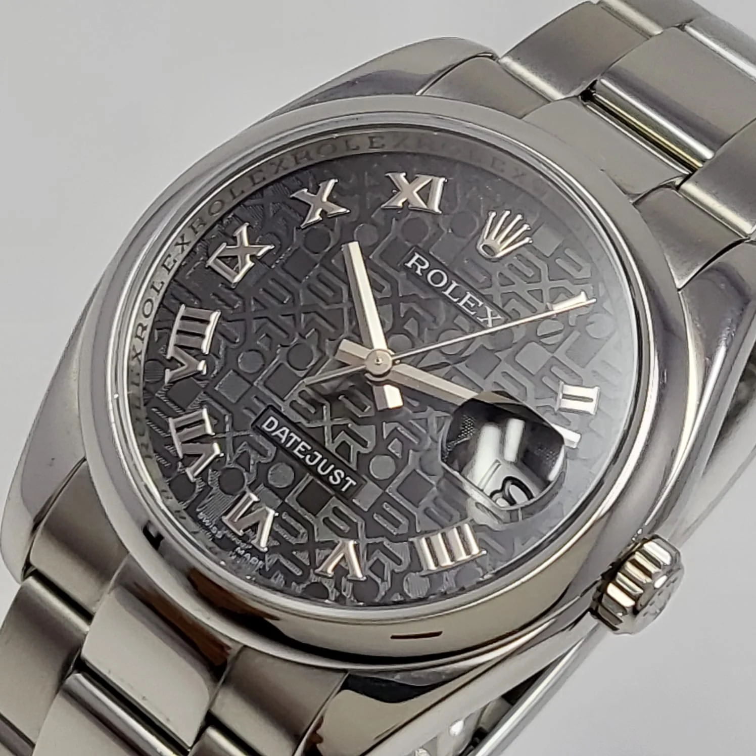 Este icónico Rolex Datejust 36 referencia 116200 combina la elegancia atemporal con un diseño único y exclusivo. Su impresionante dial negro de aniversario destaca por su textura con motivos grabados que evocan sofisticación y estilo, convirtiéndolo en una pieza única para los coleccionistas más exigentes.